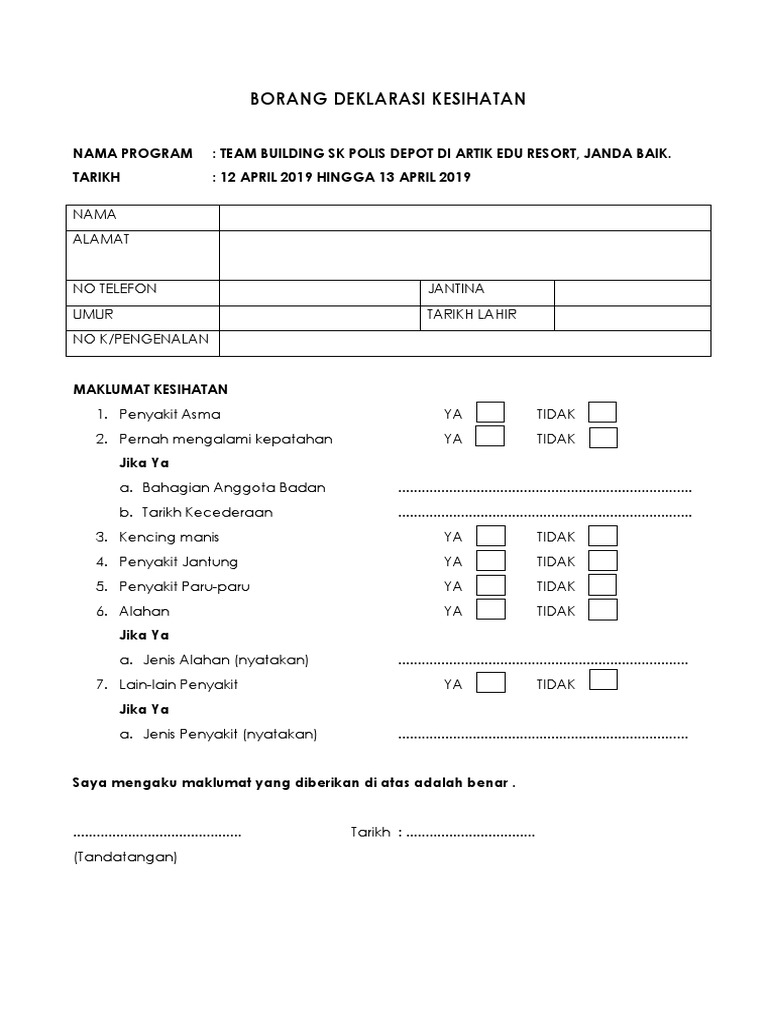 Ambil sejarah klinikal dan perjalanan pesakit seperti berikut. Beri kerjasama sekiranya dihubungi oleh pihak kesihatan. Microsoft word final borang deklarasi saringan penyakit covid docx created date. Borang permohonan membuka pintu jabatan unit bilik.