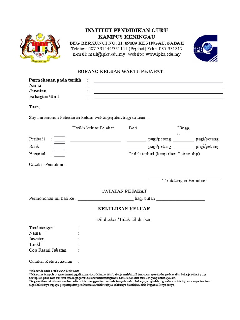 Borang keluar waktu pejabat. Meninggalkan pejabat adalah sebagaimana yang tercatat dalam kad perakam waktu berkenaan dan perlu isi dalam ruangan tempoh sebenar yang digunakan di dalam borang ini setiap kali selepas pegawai kembali ke pejabat bagi meneruskan tugasan. Borang permohonan untuk bertugas di luar ibu pejabat. Sekiranya tempoh pegawai meninggalkan pejabat dalam waktu bekerja melebihi 4 jam atau separuh daripada waktu bekerja sehari yang ditetapkan pada hari tersebut maka pegawai dikehendaki mengmabil cuti rehat atau cuti lain yang berkelayakan. Pegawai hendaklah mendapatkan kelulusan daripada pegawai penyelia terlebih dahulu sebelum meninggalkan pejabat dalam waktu bekerja dengan menggunakan borang yang disediakan dalam garis panduan ini.