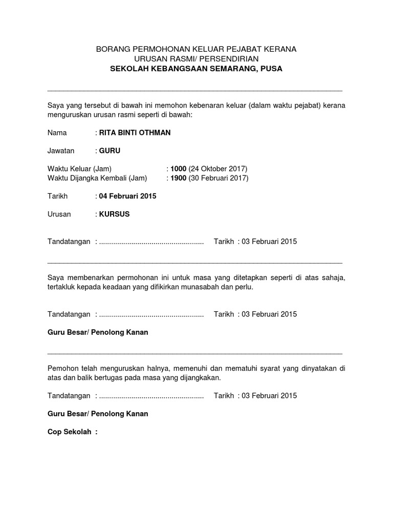 Borang permohonan melakukan pekerjaan luar kementerian kesihatan malaysia bahagian i. Borang ini perlu dikemukakan seminggu sebelum kemudahan ini hendak digunakan bagi melicinkan urusan pentadbiran pejabat. V ketua jabatan berhak menarik balik mana mana kelulusan yang telah. Pegawai hendaklah sentiasa bersedia untuk menggantikan semula tempoh waktu.