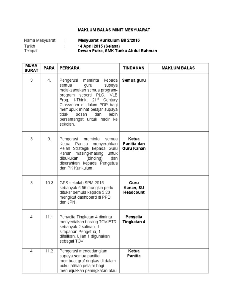 Newer post older post home. Contoh maklum balas minit mesyuarat. Maklum balas mesyuarat 3 1. Hal ini penting disebabkan setiausaha perlu merekodkan tindakan pihak yang berkenaan dalam borang maklum balas untuk dijadikan sebagai lampiran minit mesyuarat seterusnya.