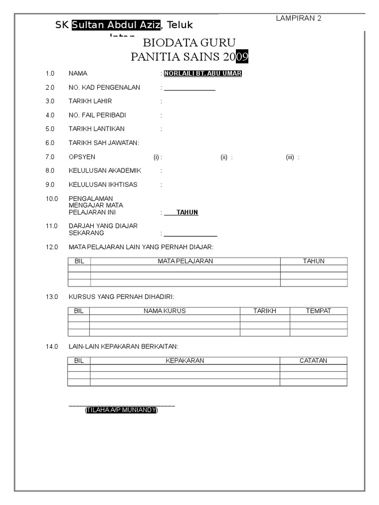 Mengikut senarai semak no fail yang kesepuluh meliputi maklumat guru seperti jadual waktu persendirian maklumat asas akademik dan ikhtisas guru serta sijil sijil penyertaan penghargaan panitia. 4 4 mendukung tandai dokumen ini sebagai bermanfaat 0 0 menolak tandai dokumen ini sebagai tidak bermanfaat tanamkan. Borang maklumat diri panitia 2015. Panitia memainkan peranan dalam membantu kemajuan akademik murid di sekolah.
