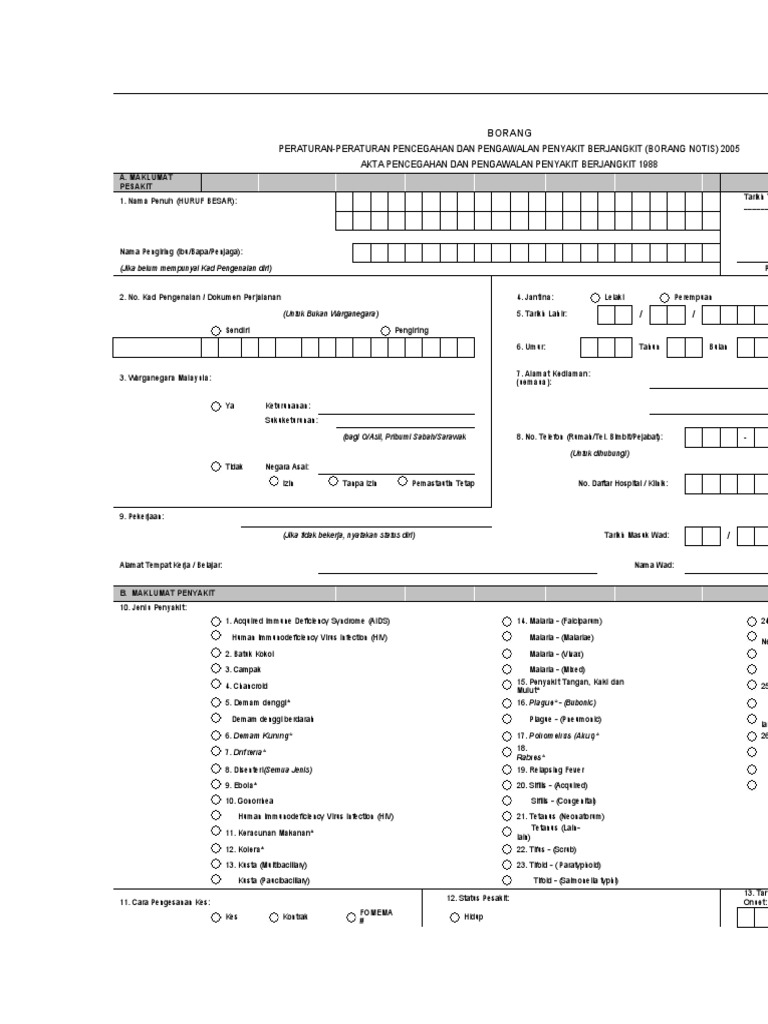 Borang notifikasi penyakit berjangkit seksyen 10 akta pencegahan dan pengawalan penyakit berjangkit 1988 selain pemberitahuan bertulis penyakit berikut perlu dimaklumkan melalui telefon dalam tempoh 24 jam iaitu poliomyelitis akut kolera demam denggi diptheria keracunan makanan plague rabies dan demam kuning b. Guide for within 24 hours notification. Notifikasi penyakit berjangkit yang dibuat akan dipantau oleh unit penyakit berjangkit di pejabat kesihatan daerah yang berhampiran dengan kawasan berlakunya sesuatu kes penyakit berjangkit. Borang notifikasi penyakit berjangkit seksyen 10 akta pencegahan dan pengawalan penyakit berjangkit 1988 jadual peraturan 2 borang peraturan 2.