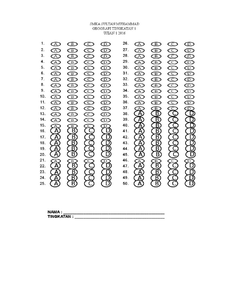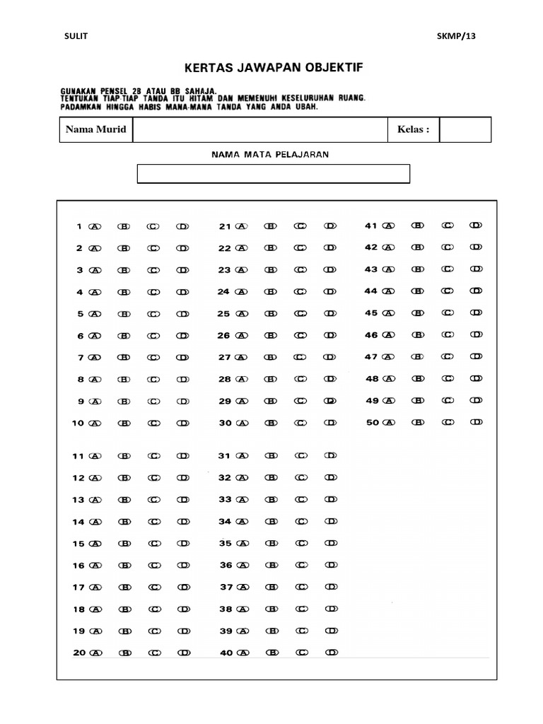 Borang omr 50 soalan. Set soalan perlu dicetak borang omr buku jawapan 5 10 muka surat tali pengikat lain lain sila nyatakan tandatangan penyelaras pensyarah tarikh. Kertas jawapan untuk soalan objektif 20 soalan ini saya susun selaras dengan perubahan format soalan 2016. Tarikh peratusan pemegangan syer 31 12 2010 p. Contoh kertas jawapan objektif.