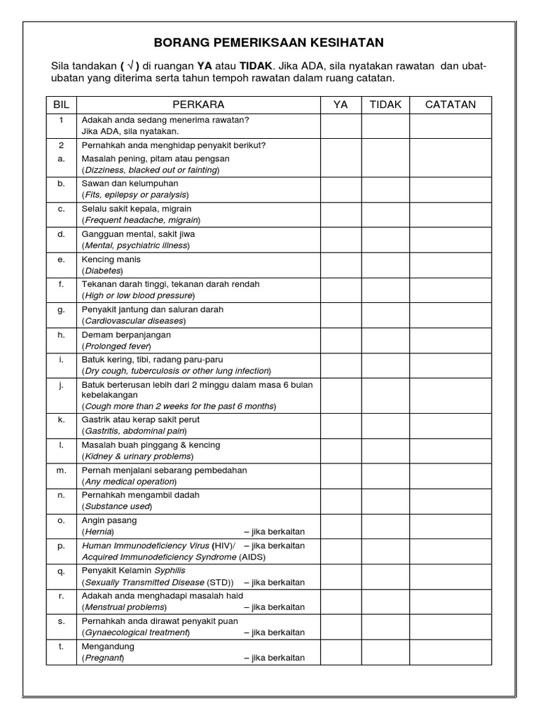 Pemeriksaan kesihatan adalah gambaran kesihatan anda untuk mengesan tanda tanda tidak dijangka yang mana rawatan khusus yang berkesan boleh diberikan. Intipati pemeriksaan kesihatan biasa adalah semata mata untuk memastikan bahawa anda kekal di â pink of healthâ. 1 2013 pemohon hendaklah mengisi maklumat di bahagian a b dan c dan menyerahkan borang ini berserta surat. Untuk tujuan pemeriksaan pemohon hendaklah membawa mata jika pernah memakainya dan laporan kaca.