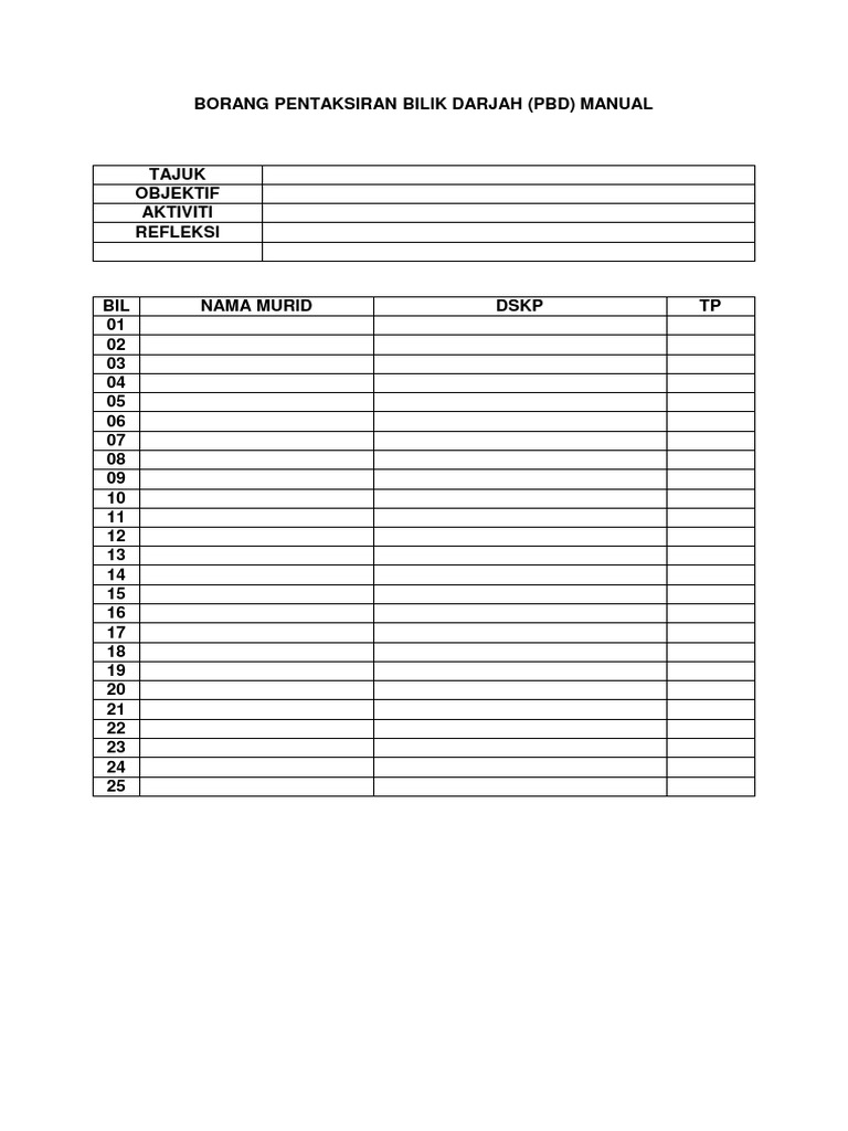 Koleksi bahan bahan pendidikan untuk warga guru ibu bapa dan murid pautan download percuma. Pentaksiran bilik darjah pbd merupakan pentaksiran berterusan dalam sesi pengajaran dan pembelajaran bagi mendapat maklumat kemajuan perkemnbangan dan kebolehan murid. Himpunan templat pelaporan pentaksiran bilik darjah pbd tahun 2 mohd suhaimin isnen. Templat pelaporan pbd adalah khusus untuk kegunaan semua guru mata pelajaran bagi pelaporan tahap penguasaan tp dalam pentaksiran bilik darjah pbd.