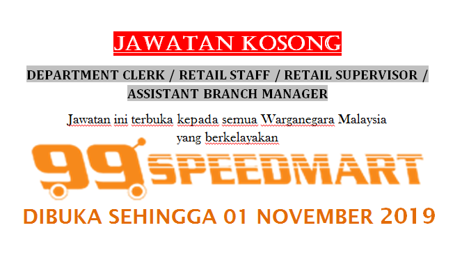 Jawatan kosong terkini 99 speed mart sdn bhd. Permohonan jawatan kosong 99 speed mart sdn bhd. Maklumat kekosongan ini adalah seperti yang diiklankan. 1 permohonan jawatan kosong 99 speed mart sdn bhd hendaklah dibuat secara on line dan atas talian sahaja melalui jobsmalaysia.