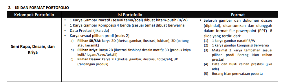 File portofolio seni rupa desain dan kriya. Seni rupa desain dan kriya. Dalam mengisi borang portofolio bidang seni atau keolahragaan mungkin saja peserta snmptn mengalami kesulitan. Kondisi fisik riwayat penyakit catatan khusus jika ada dan pernyataan sehat tidak sehat.