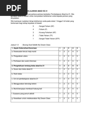 Soal selidik pelaksanaan pembelajaran abad ke 21 pak21 nama sekolah. Maklumat yang diperoleh daripada kajian ini adalah sulit dan hasil kajian ini hanya digunakan untuk laporan kajian sahaja. Menghasilkan kemahiran abad ke 21 pelajar di semua institusi pendidikan. Domain kemahiran abad ke 21 yang dikaji terdiri daripada lima komponen utama iaitu kemahiran.