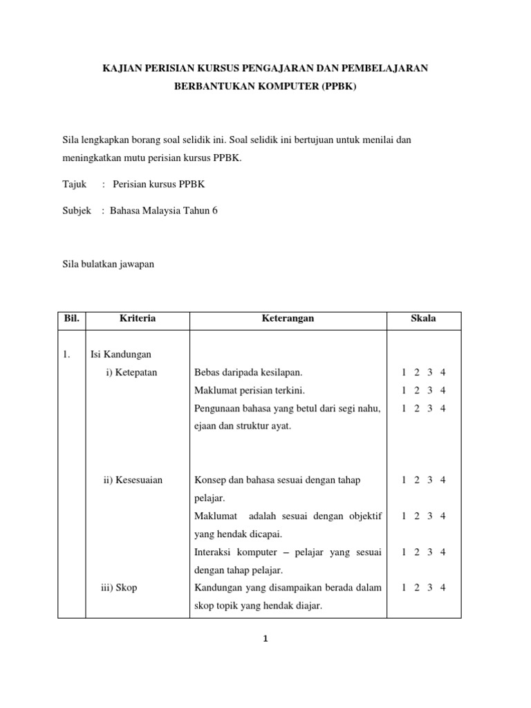 5 tempat lawatan yang dilawati sesuai dengan kursus yang dipelajari. Borang soal selidik ini bukan satu ujian dan tidak ada jawapan salah atau betul serta bukanbertujuan untuk menguji pelajar 3. P 6 ensy arh s ebag if li to epanjang law nka dm kada elah. Setakat ini data dari kaji selidik telah menyumbang banyak dalam hal penyelidikan di dalam berbagai industri.