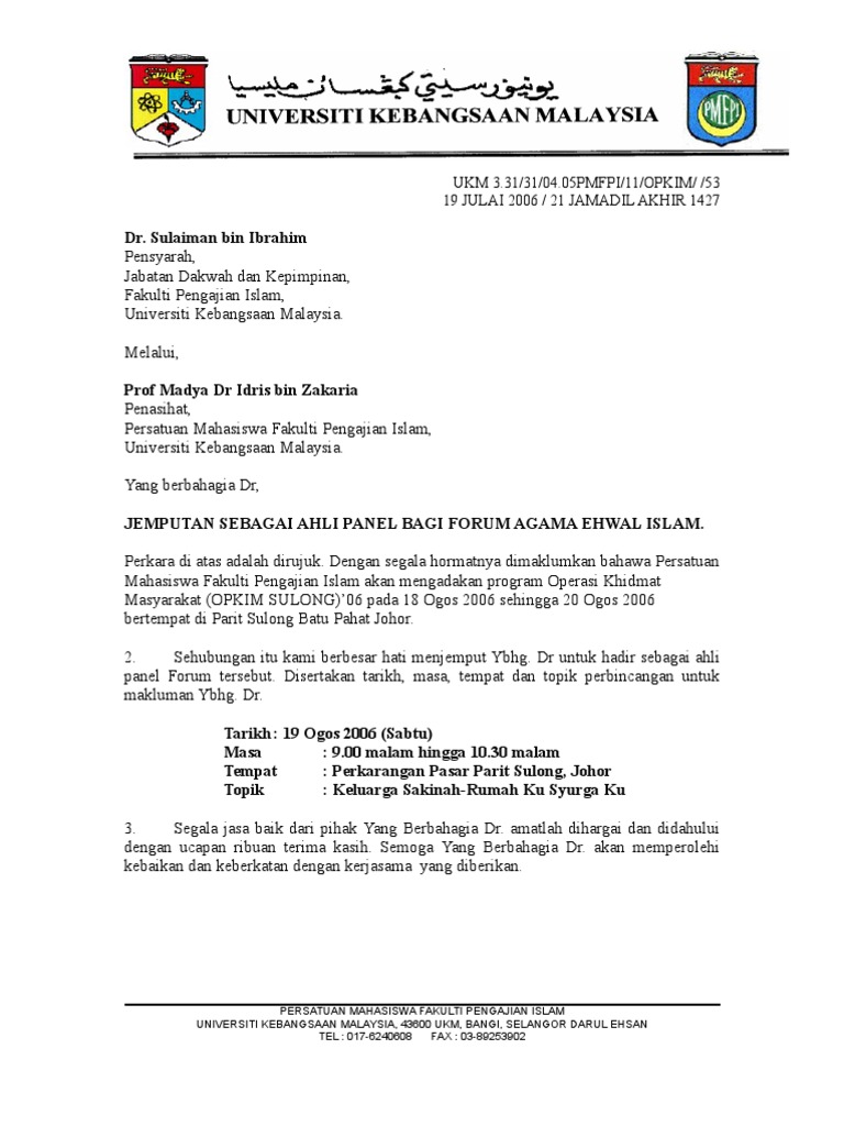Contoh surat jemputan penceramah ruj.