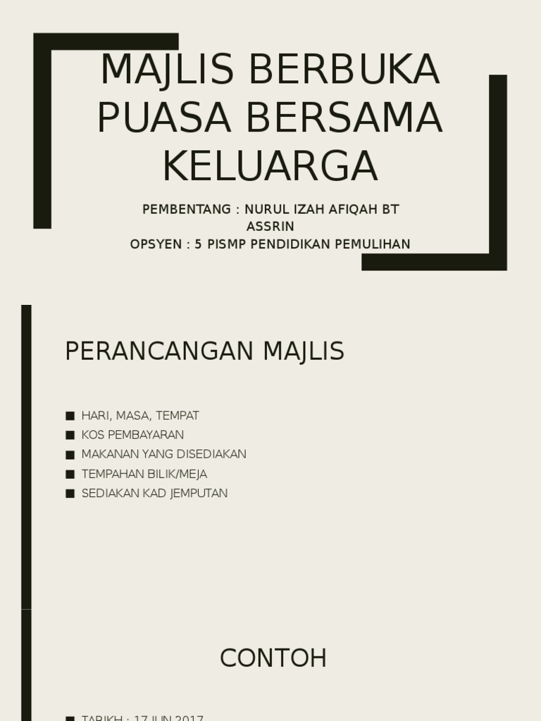 Contoh kad jemputan majlis berbuka puasa. Gembar gemburkan binaan dengan memberikan kad jemputan yang dicetak secara profesional. D aturcara majlis 6 30 petang ketibaan jemputan tetamu 6 45 petang ketibaan pendaftar usim 6 50 petang aluan majlis oleh mc 6 55 petang ucapan presiden penaja pragmatis 7 05 petang ucapan pandaftar usim 7 20 petang persiapan berbuka 7 21 petang azan bacaan doa berbuka puasa berbuka puasa solat maghrib jamuan. Majlis berbuka puasa adalah merupakan salah satu aktiviti di dalam program ihya ramadhan. Surat jemput hadir majlis berbuka puasa 2013.