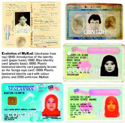 Evolusi kad pengenalan. Kad pengenalan pada mulanya diperkenalkan oleh pemerintah inggeris di malaya kad pengenalan ini digunakan untuk tujuan pengecaman dan pengagihan beras pada zaman darurat kad pengenalan mempunyai pelbagai fungsi dan ciri ciri keselamatan penggunaan kad pengenalan pertama ini dilaksanakan di seluruh tanah melayu dari tahun 1948 hingga 1960. 1960 evolusi kad pengenalan semakin baik ketika itu dengan diperkenalkan kad pengenalan plastik. Kad pengenalan pada mulanya diperkenalkan oleh pemerintah inggeris di malaya kad pengenalan ini digunakan untuk tujuan pengecaman dan pengagihan beras pada zaman darurat kad pengenalan mempunyai pelbagai fungsi dan ciri ciri keselamatan penggunaan kad pengenalan pertama ini dilaksanakan di seluruh tanah melayu dari tahun 1948 hingga 1960. Jumlah itu termasuk pengeluaran mykad bagi gantian untuk permohonan disebabkan kes kerosakan dan kehilangan.