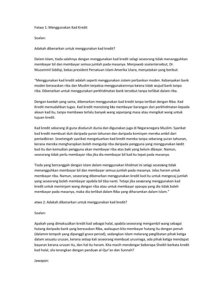 Fatwa kad kredit. Harus boleh membayar zakat melalui kad kredit kad bank islam dengan syarat disertai niat yang ikhlas. Penggunaan kad kredit menurut neraca shariah disediakan oleh. Pertama dalam pengembalian kredit kartu kredit bisa dilakukan dengan dua cara pertama melunasinya kedua dengan cara diangsur. Atas asas fiqh apakah kedua dua penyokong dan penentang kredit kad meletakkan pandangan mereka yang menghalalkan dan mengharamkan.