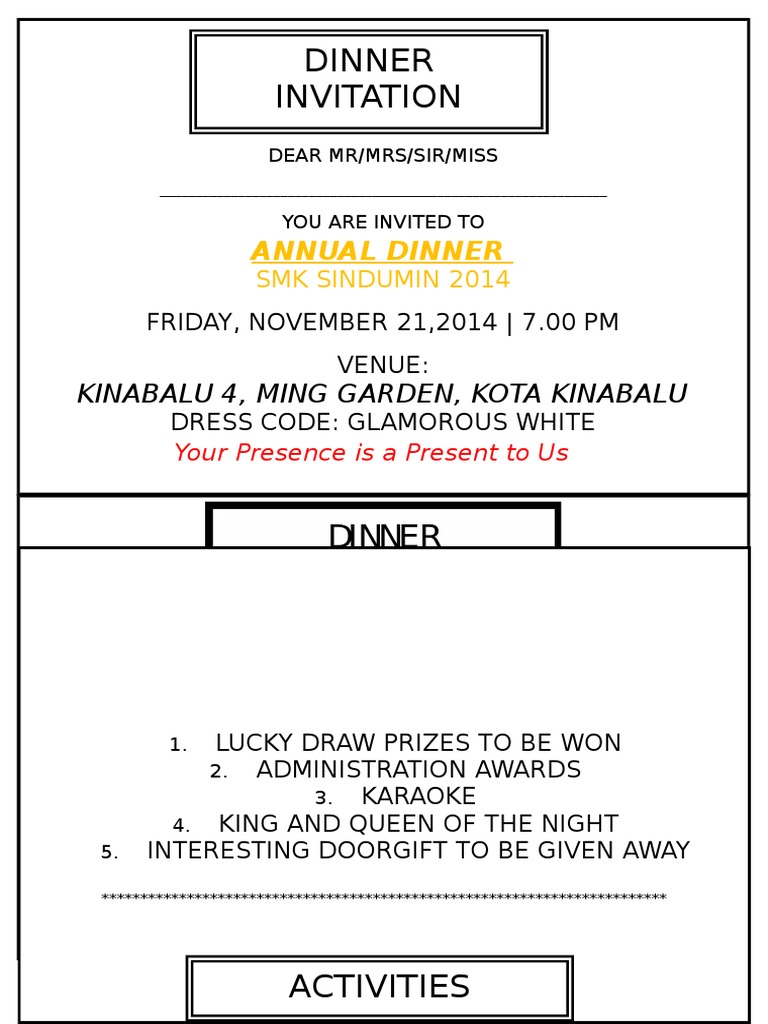 Anda boleh mengedit dan menyimpan kad jemputan raptai majlis makan malam sekerap yang anda mahu. Ingat theme for annual dinner akan menentukan tahap keseronokan majlis. The dinner which starts at 7 30 pm will be graced by our guest of honour yab dato sri hj adnan bin hj yaakob ssap dsap dgsm menteri besar pahang. Untuk majlis perpisahan tahun 6.