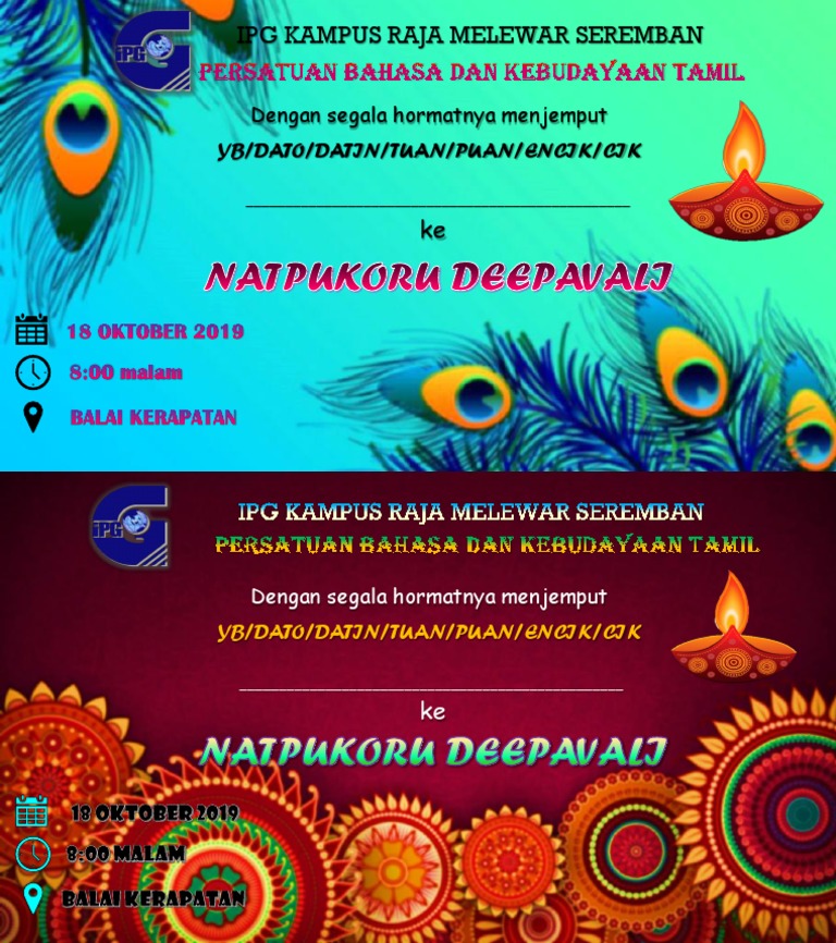 Kad jemputan deepavali. Sila tengok kad jemputan di atas tertera aturcara majlis. Gembar gemburkan binaan dengan memberikan kad jemputan yang dicetak secara profesional. Pelbagai e kad untuk majlis dan hari kerayaan dalam bahasa inggeris dan bahasa cina boleh didapati. Chetak kad menjual kad siap dibuat untuk musim perayaan seperti berikut.