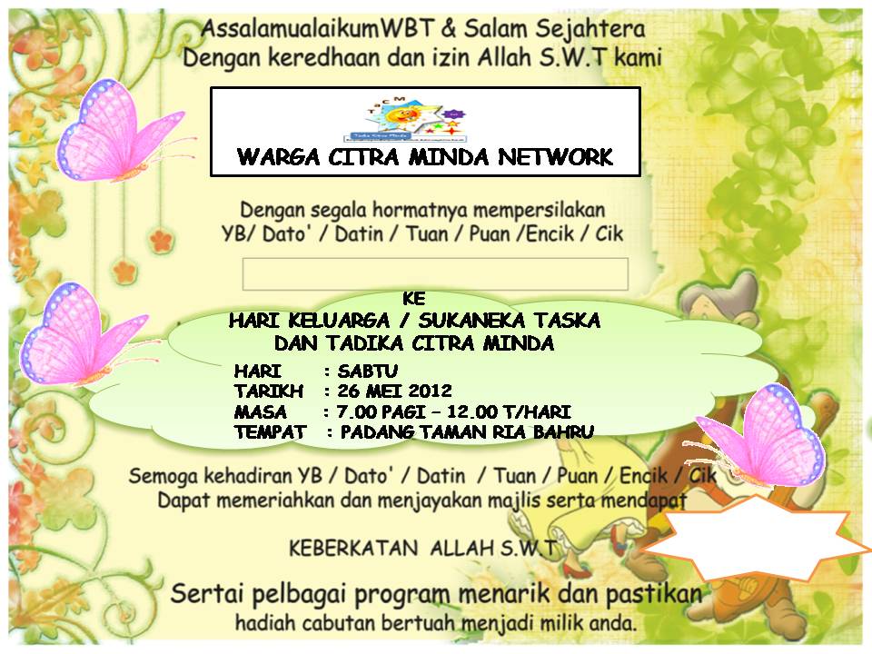 Kad jemputan merupakan satu kad untuk menjemput para hadirin khusnya kaum keluarga sahabat handai sanak saudara dan sebagainya untuk sama sama menghadiri dalam satu majlis yang telah dirancang dan akan diadakan. Surat jemputan rasmi ke majlis hari keluarga hj othman amp hjh mariyam jemputan rasmi http wayanadnoticeboard com admini kad jemputan rasmi. Hari keluarga ppsm 13 7 disember 2013 lampiran b tentatif program program hari keluarga ppsm 2013 kelab matematik ukm tarikh masa acara tempat 17 disember 2013 8 00 pagi 9 00 pagi 10 00 pagi 11 00 pagi 11 30 pagi 1 30 tengahari 2 00 petang 4 00 petang 8 00 malam 11 00 malam pendaftaran peserta sarapan kehadiran para jemputan. Gembar gemburkan binaan dengan memberikan kad jemputan yang dicetak secara profesional.