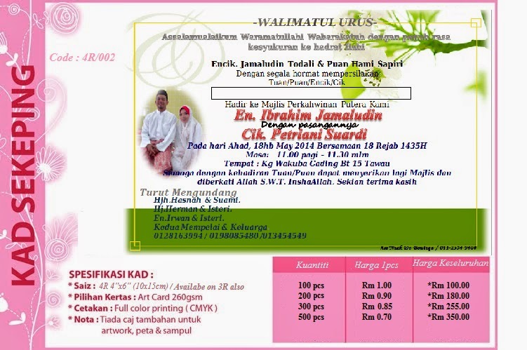 Gambar dan ayat disediakan mengikut warna pilihan anda secara percuma. Khidmat pelanggan melalui official facebook fanpage kami kad kahwin tawau. Ianya melintang dan menggunakan tali utk digantung berbeza dengan banting. Harga ditentukan melalui saiz yang diinginkan.