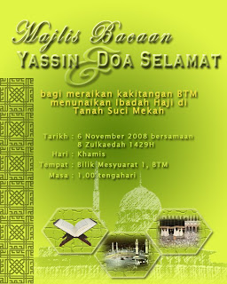 Jemputan ke majlis bacaan yasin doa selamat solat hajat dan penghargaan pasti putra permai dengan sukacitanya kami ingin menjemput tuan puan sekeluarga ke majlis bacaan yasin doa selamat dan penghargaan pasti putra permai pada. Jemputan majlis bacaan yassin tahlil arwah serta kenduri aqiqah. Jemputan ke majlis doa selamat dan kesyukuran beserta bacaan. Posted by tamandesapermai3 on thursday may 21 2009 sempena program bacaan yasin dari rumah ke rumah minggu ini cikgu khalid menjemput semua penduduk taman desa permai3 ke majlis bacaan yasin dan tahlil dirumahnya.