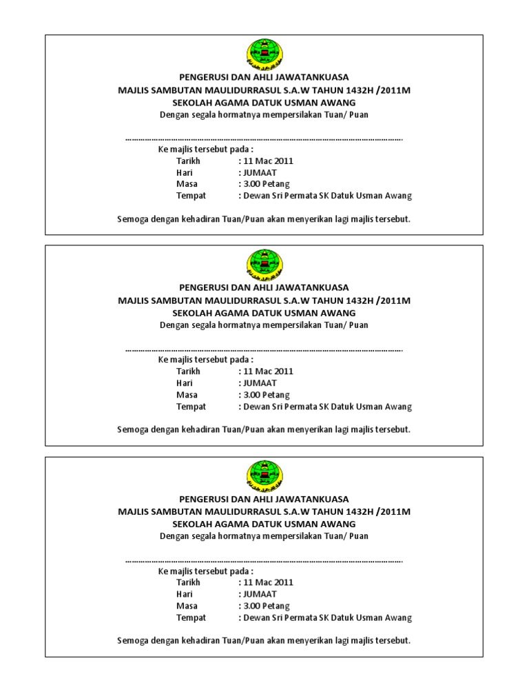 Jemputan menyertai perarakan majlis sambutan maulidur rasul peringkat negeri pulau pinang tahun 1441h 2019m dengan segala hormatnya saya diarah untuk menarik perhatian ybhg. Dewan sri permata sk datuk usman awang semoga dengan kehadiran tuan puan akan menyerikan lagi majlis tersebut. Merancang dan menguruskan cetakan kad jemputan banting banner billboard backdrop kad aturcara dan sijil bagi majlis keagamaan peringkat negeri maal hijrah maulidur rasul pelancaran ihya ramadhan majlis tilawah al quran majlis menghafaz al quran dan lain lain. Gembar gemburkan binaan dengan memberikan kad jemputan yang dicetak secara profesional.