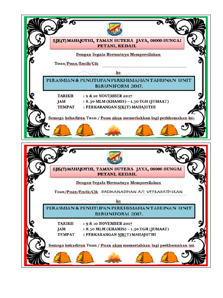 Kad jemputan perkhemahan. Menyedia dan membuat urusan pos surat dan kad jemputan kepada tetamu 2. Untuk meletakkan gambar anda dan pasangan biarlah bersesuaian dengan tema kad anda. Kad jemputan merupakan satu kad untuk menjemput para hadirin khusnya kaum keluarga sahabat handai sanak saudara dan sebagainya untuk sama sama menghadiri dalam satu majlis yang telah dirancang dan akan diadakan. Memastikan semua peserta perkhemahan mengikuti program di surau 5.