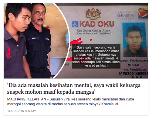 Kad oku mental. Definisi oku mengikut akta orang kurang upaya 2008 oku termasuklah mereka yang mempunyai kekurangan jangka panjang fizikal mental intelektual atau deria yang apabila berinteraksi dengan pelbagai halangan boleh menyekat penyertaan penuh dan berkesan mereka dalam masyarakat. Siasatan awal mendapati suspek adalah oku mental dan mempunyai kad oku sejak 2015. Kita sedang menunggu laporan psikiatri untuk tindakan lanjut katanya dalam satu kenyataan hari ini. Hasil pemeriksaan mendapati lelaki itu merupakan orang kurang upaya oku mental dan mempunyai kad oku sejak 2015.