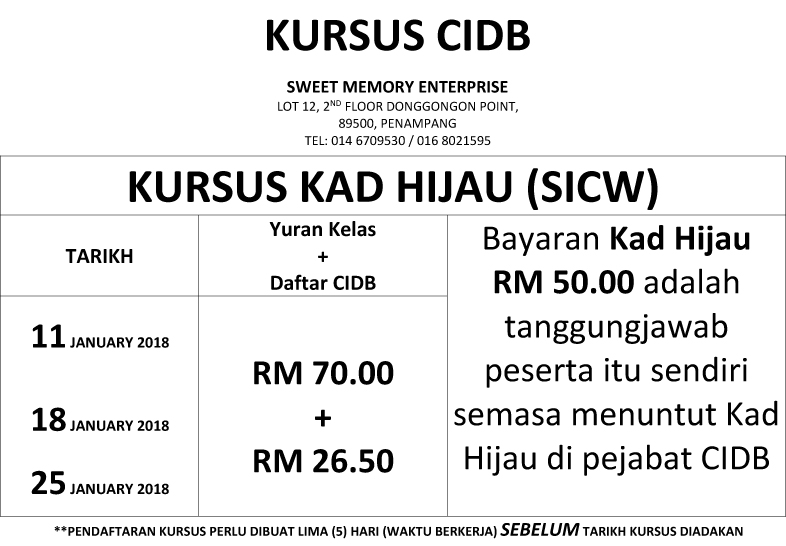 Kursus kad hijau cidb 2018. Untuk pengetahuan semua cidb telah pun menaikkan kadar servis mereka untuk permohonan kad hijau. Peserta atau syarikat bolehlah melantik saya untuk membuat permohonan kad hijau iaitu 135 ringgit sahaja termasuk yuran proses. Untuk pengetahuan semua cidb telah pun menaikkan kadar servis mereka untuk permohonan kad hijau. Hse dynamic consultancy merupakan syarikat yang mendapat pertauliahan daripada cidb untuk mengendalikan kursus sicw kad hijau.