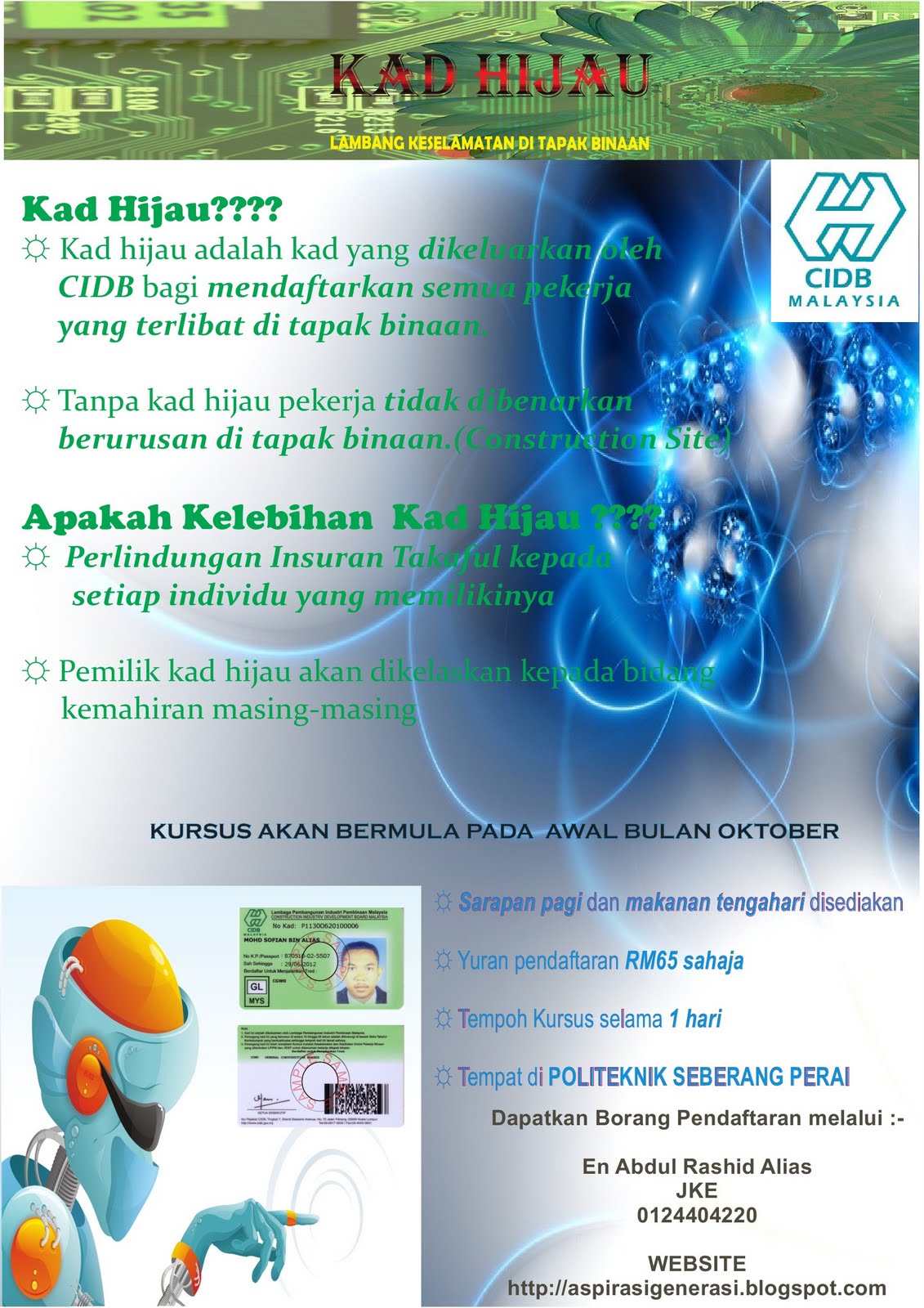 Kami akan berikan maklumbalas secepat. Kad hijau cidb juga dikenali sebagai kad personel binaan. Ia adalah perakuan bagi pekerja binaan yang telah menjalani kursus latihan keselamatan di tapak pembinaan yang dikeluarkan oleh lembaga pembangunan industri pembinaan malaysia atau juga dikenali sebagai construction industry development board cidb malaysia. Pekeliling kursus kad hijau cidb bil 1 2000 rujuk gambar pekeliling kursus kad hijau cidb bil 1 2001 rujuk gambar denda rm 5 000 dikenakan kepada kontraktor utama dan personel sekiranya bekerja di tapak pembinaan dengan tidak memiliki kad hijau yang sah.