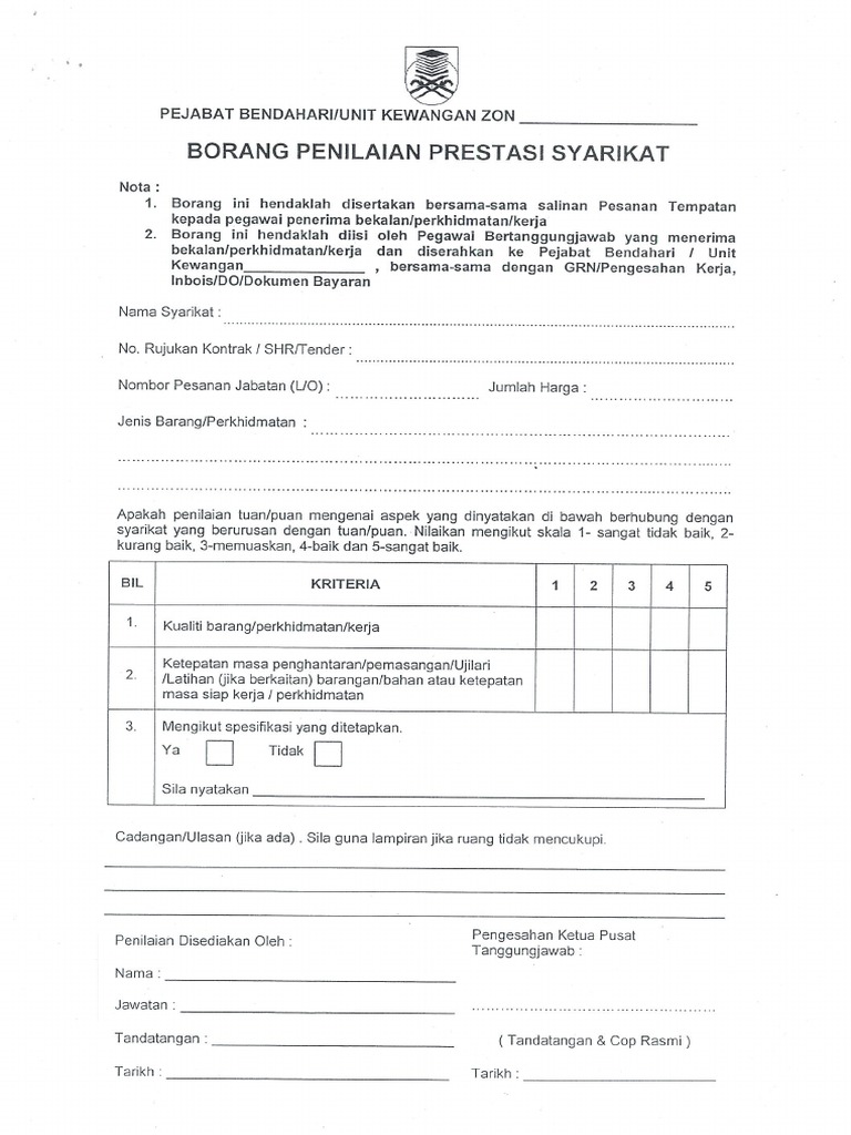 Semasa mempertimbangkan keputusan penilaian prestasi secara rasmi. Penilaian aspek penghasilan kerja dibuat berpandukan kriteria penilaian yang ditetapkan masing masing dalam borang lnpt jpa prestasi 3 2002 4 2002 dan 5 2002 dan skala penilaian seperti di lampiran b borang laporan penilaian prestasi tahunan berkenaan. Hasil kerja sentiasa menemui tahap maksimum yang telah ditentukan 1. Borang penilaian prestasi pegawai pegawai bahagian i borang penilaian prestasi pegawai pegawai bahagian ii.