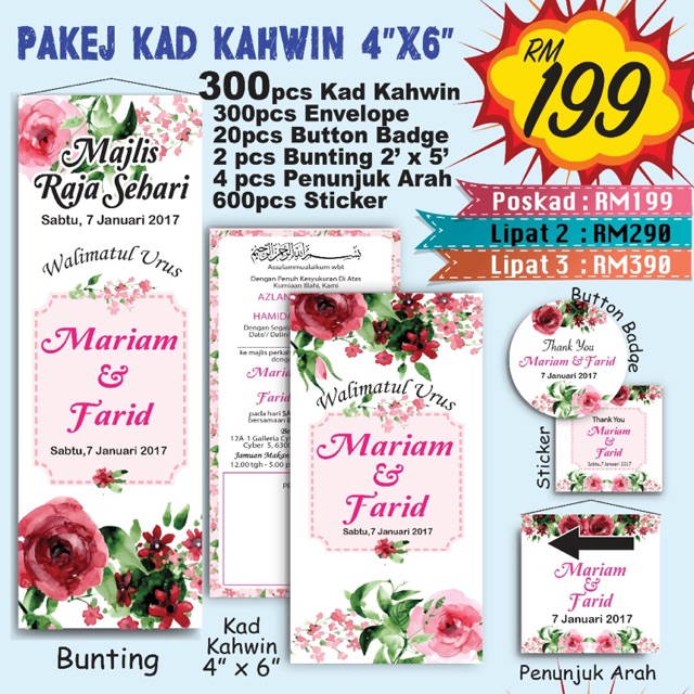 Kualiti printing yang jelas. Tawaran pakej termurah dari kami dengan kualiti cetakan yang tinggi. Kad kahwin percuma sampul kad. Bunting 2 5 kaki per segi 2pcs banner 7 3 kaki per segi 1pc penunjuk arah 2 1 5 kaki per segi 5pcs percuma design list design boleh pilih dari website atau facebook kami kad jemputan digital percuma untuk jemputan melalui facebook whatsapp.