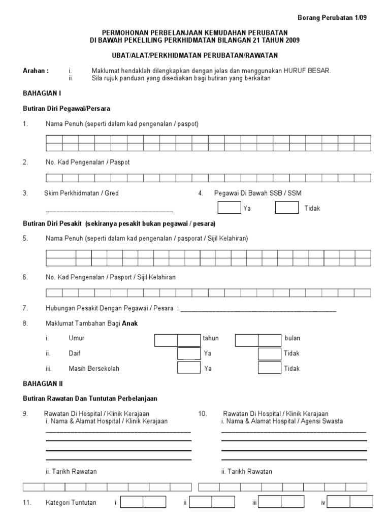 Borang perubatan 1 09 permohonan perbelanjaan kemudahan perubatan di bawah pekeliling perkhidmatan bilangan 21 tahun 2009 ubat alat perkhidmatan perubatan rawatan i.