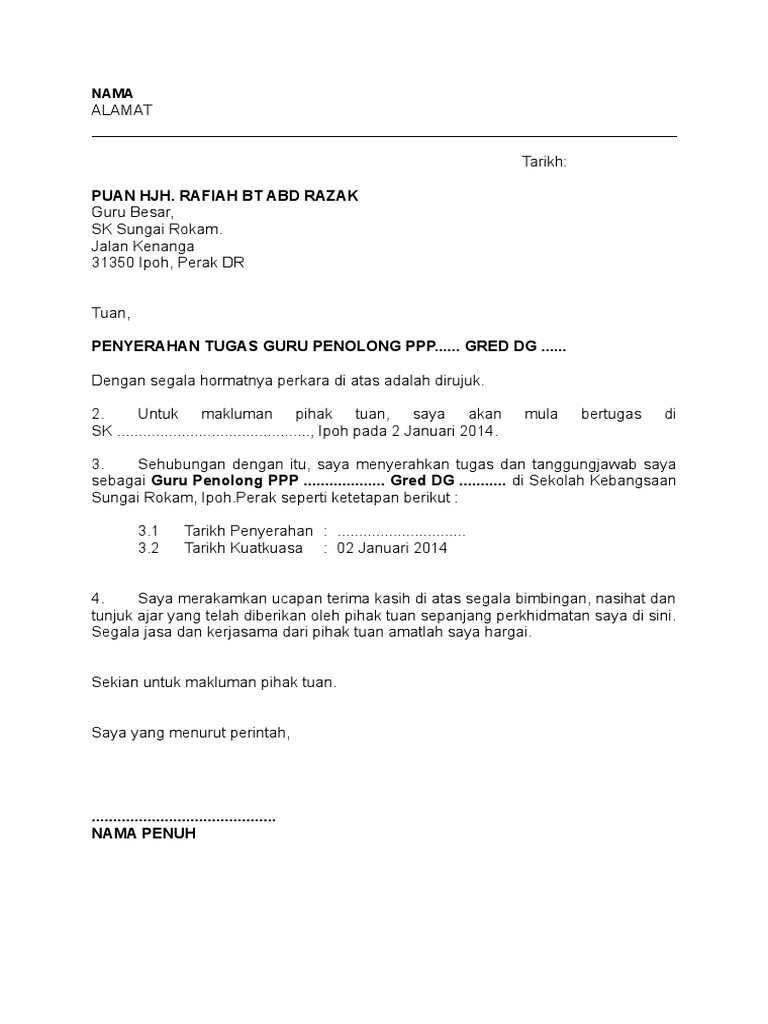 Surat penyerahan dan akuan terima nota serah tugas a adalah saya mohd jeffreen bin mohd khadzri yang memegang jawatan pembantu tadbir n17 di kementerian jabatan bahagian inspektorat dan audit dalam dari tarikh 17 11 2016 hingga 1 4 2016 bersama sama ini menyerahkan nota serah tugas sepertimana diarahk. Jabatan sekolah catatan. Sebelum mengakhiri perkhidmatan di stesen lama nota serah tugas merupakan satu dokumen yang sangat penting untuk disediakan dan perlu diserahkan kepada sekolah terdahulu sebelum mula berkhidmat di sekolah baru. Surat penyerahan dan akuan nota serah tugas 2.
